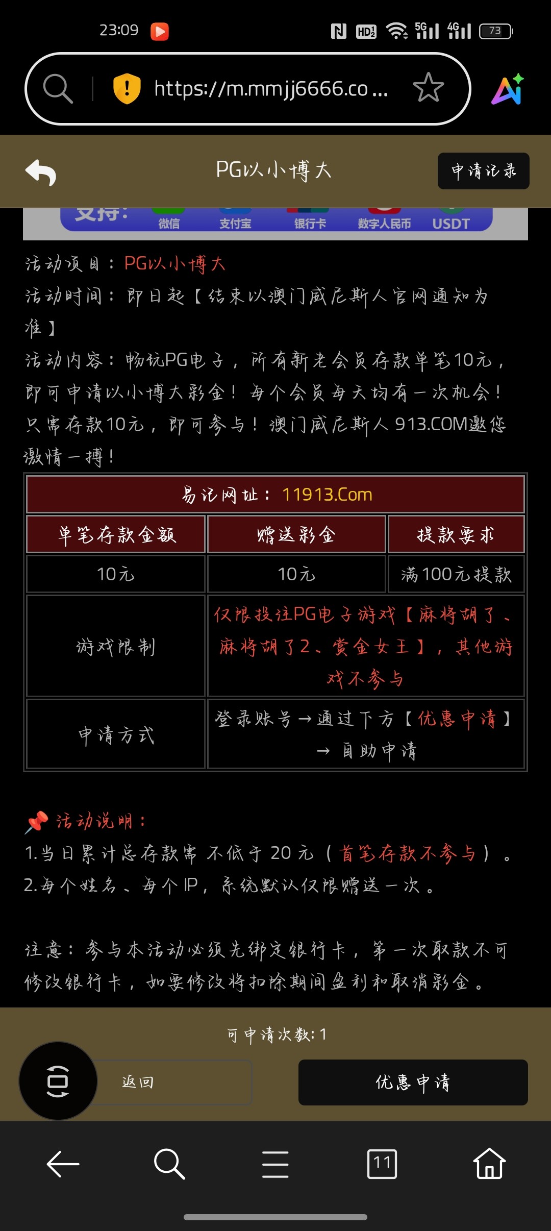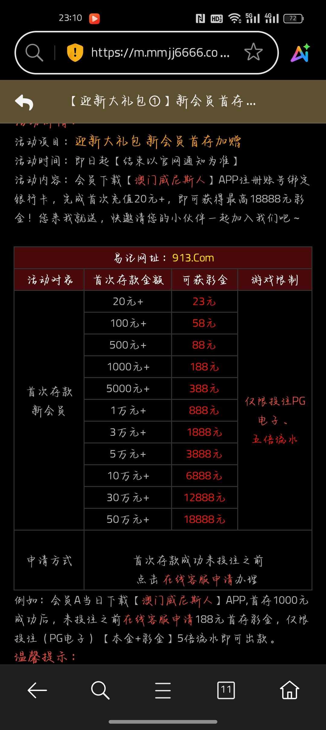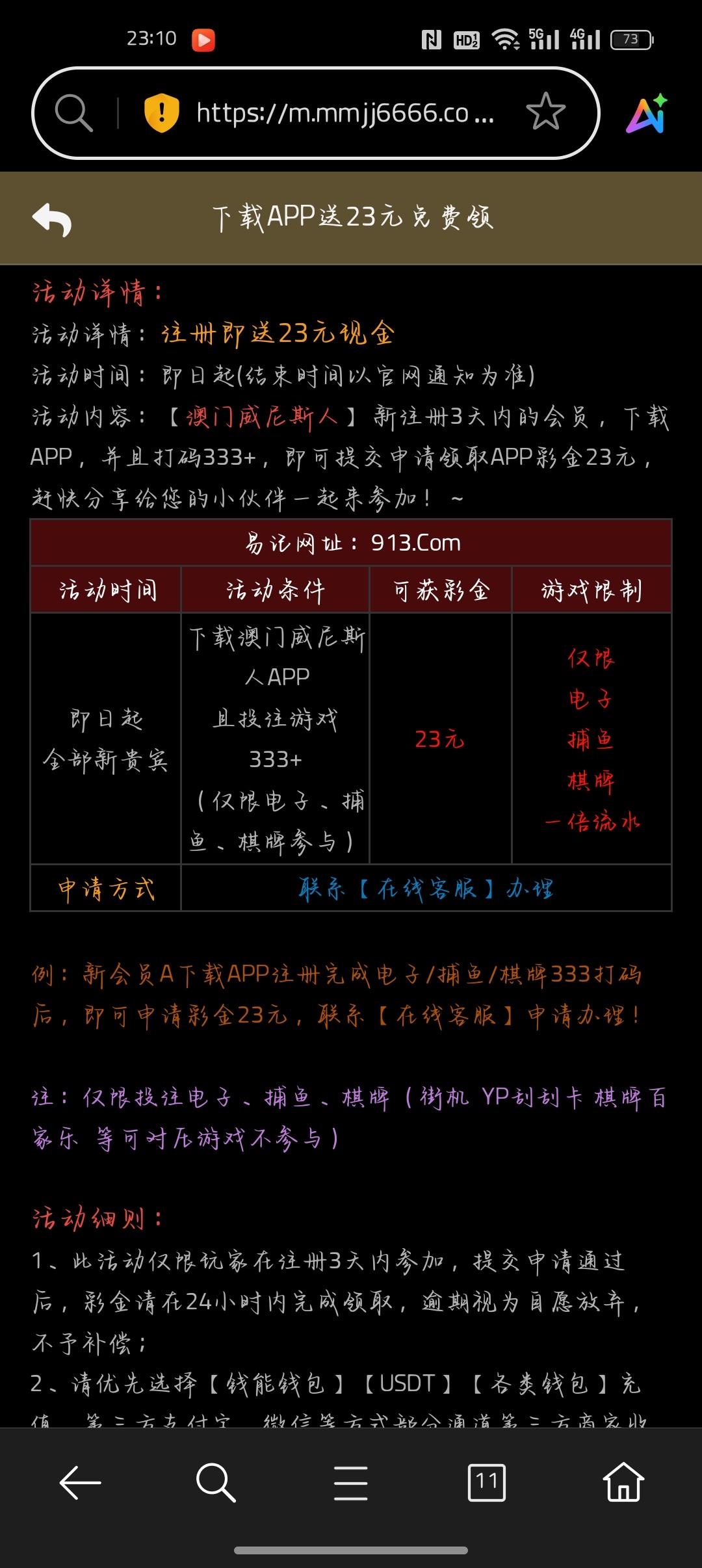 刚刚短信发给我的台子但没有特邀彩金,看了一下活动有每日以小博大活动但需要先充值够20才行,还有首存20+23,有包赔,下载app还能领23但要打码够333,可以用以小博大或首存打流水,注册满7天还有免费6元领取,出款自测,怕黑的可以无视