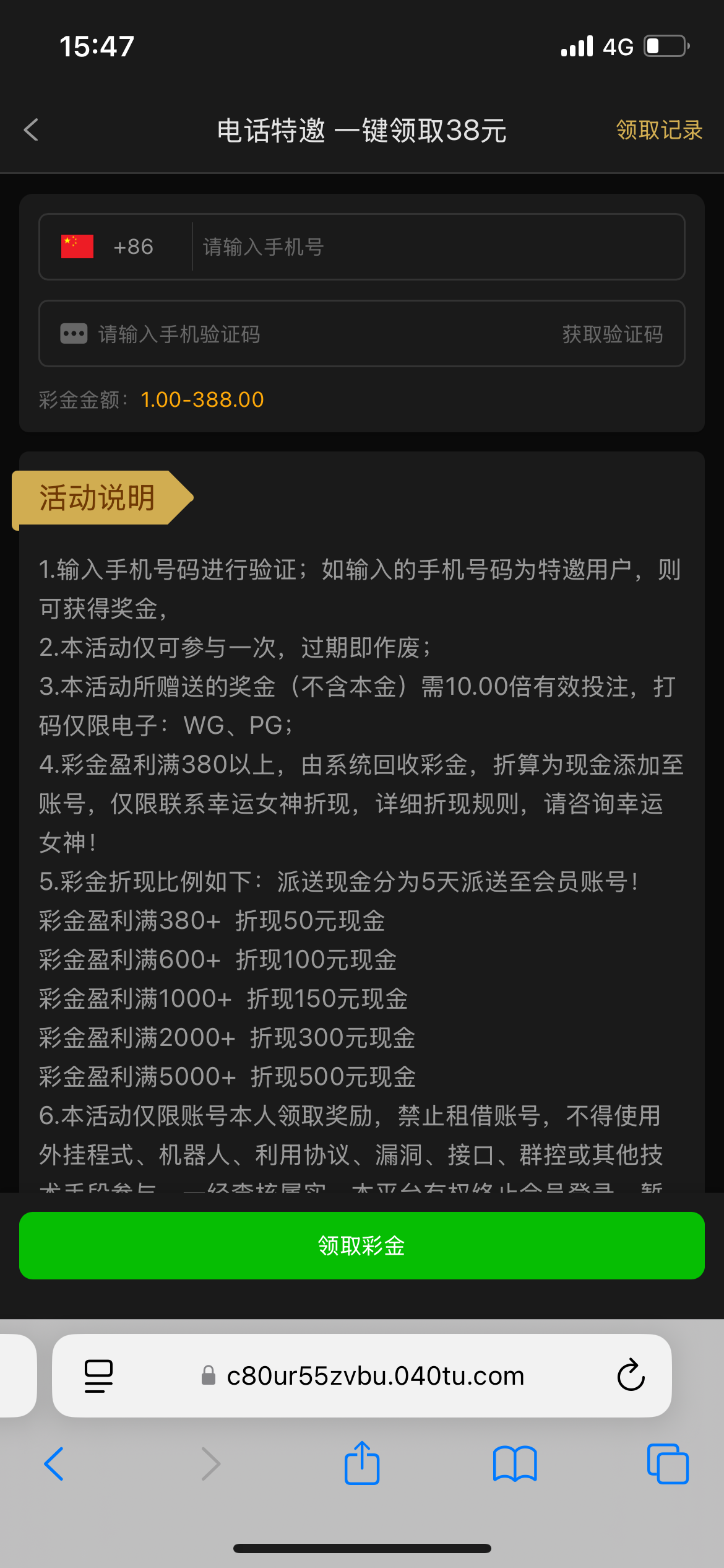 垃圾台打到380才可以兑换成50彩金还TM分5天给,这项目适合赌神们