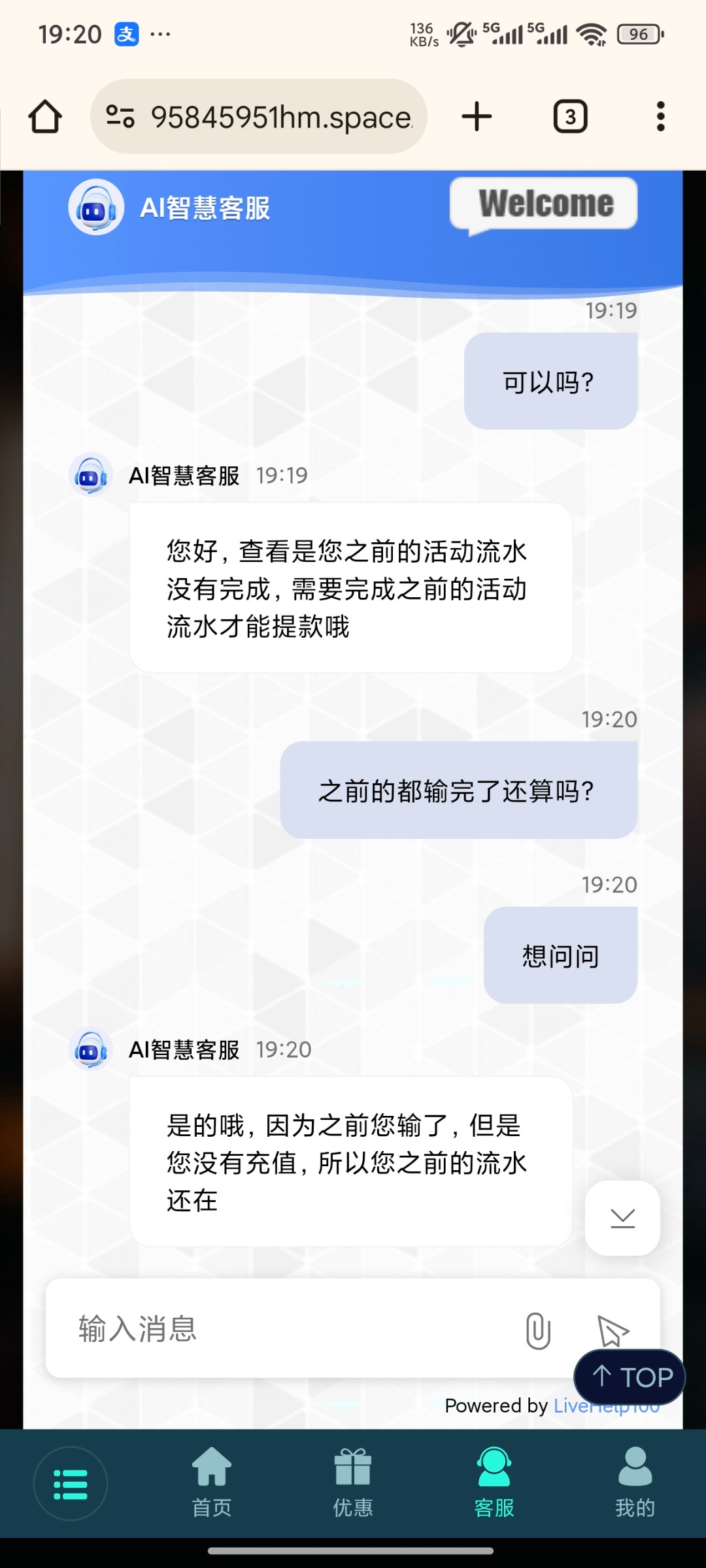 打到100不给提,上个月也充值玩了,流水不刷新。之前不管充值还是活动领的打输了流水都不给清
